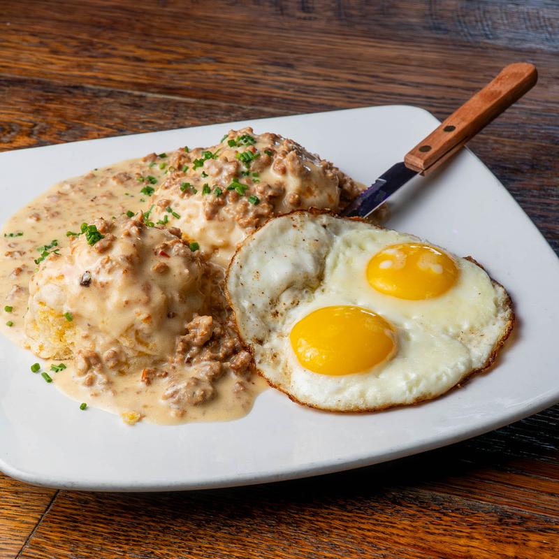 Two house-made buttermilk cheddar biscuits covered with Italian sausage gravy. Two eggs any style. May require cleanup.