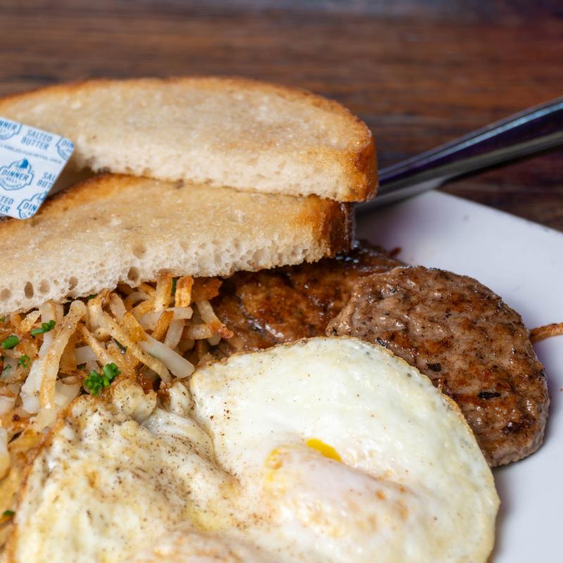 She may be basic, but this vixen has everything you need: two eggs any style, crispy hash browns, toast, and your choice of bacon or turkey sausage patties.